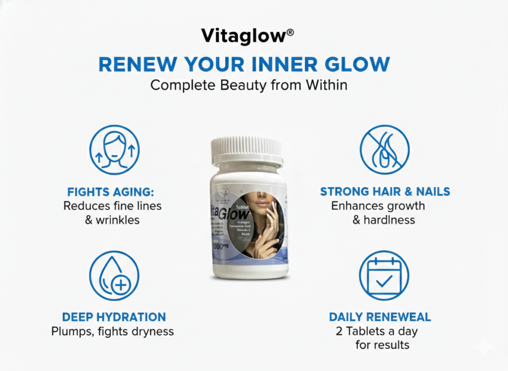 Vita Glow Tablets help: Improve skin glow, firmness, and elasticity. Enhance skin hydration and smooth texture. Strengthen hair and reduce hair fall. Support stronger, healthier nails. Promote natural collagen production. Slow down signs of aging.