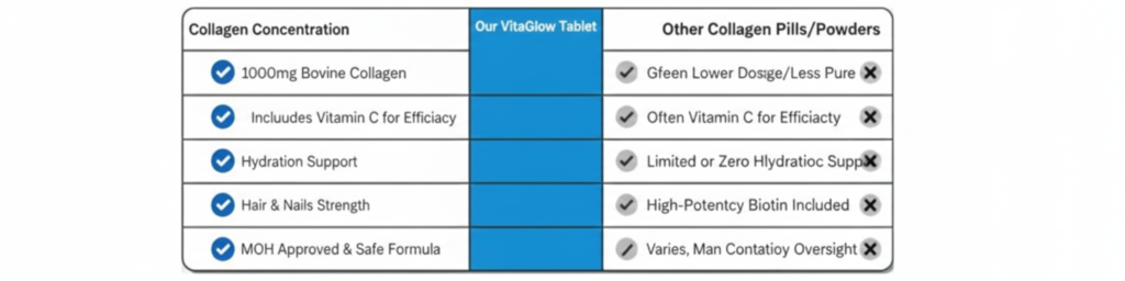 Vita Glow Collagen Tablets are a premium bovine collagen supplement formulated to support skin glow, hair strength, and nail health from within. Each tablet contains 1000 mg Collagen, enriched with Biotin (Vitamin B7), Hyaluronic Acid, and Vitamin C to maximize absorption and visible results.